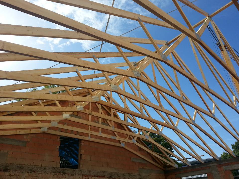 Die Krone für Ihr Haus: der Dachstuhl. Dachstühle gibt es in verschiedenen Ausführungen, die wir genau auf Ihren Wunsch und passend für Ihr Haus anfertigen. Jeden Dachstuhl zeichnen wir zunächst selbst. Die Vorfertigung wird nach traditioneller Handwerkskunst und mit modernster Technik ausgeführt. Die passgenaue Vorfertigung ist ein wichtiger Arbeitsschritt, um beim Richten eine kurze Arbeitszeit und exakte Ergebnisse zu gewährleisten. Aufbauend auf den Dachstuhl kann das Dach dann gedämmt und eingedeckt werden. Ein Dachstuhl ist jedoch nicht nur ein notwendiger Teil des Daches, er kann auch sehr ästhetisch von unten in Szene gesetzt werden, sodass man die Holzbalken vom Innenraum aus betrachten kann.